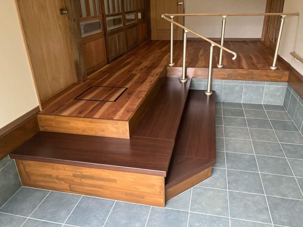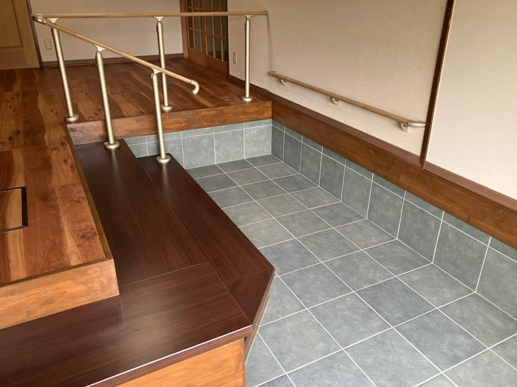 既存の床と土間を一度すべて解体し、構造から見直すことで、お客様が思い描く理想の形を自由に実現できる状態にしました。 土間部分を広く確保することで、動線に余裕が生まれ、開放感のある使いやすい玄関へと生まれ変わりました。 またバリアフリーに対応した使い勝手のよい手摺りはお客様から好評をいただいております。