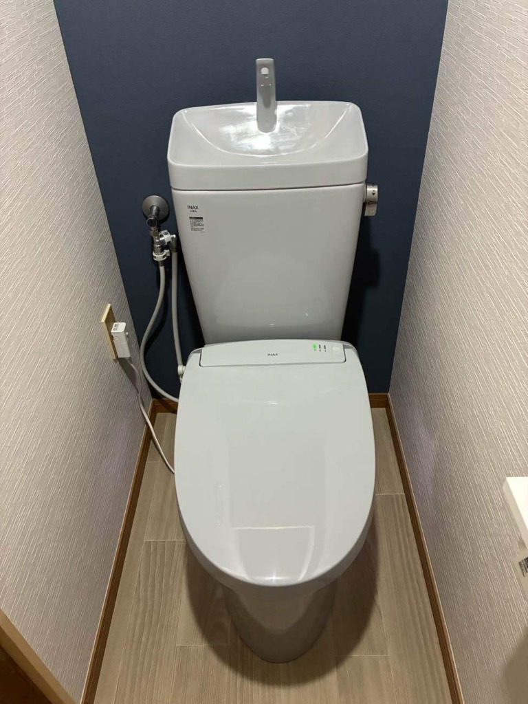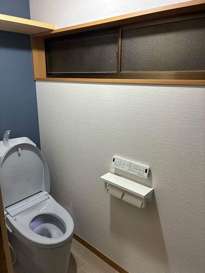 床と壁のタイルを解体し、床はクッションフロア、壁はクロス仕上げへと一新しました。 昔ながらの真壁から、大壁へと変更することで、より洋室らしい印象にイメージチェンジ。 トイレは自動洗浄・自動開閉付きで機能性も抜群。ブルーグレーの色味が上品で、内装との調和も取れています。 クロスの色を切り替えたことにより、青と白のくっきりとしたコントラストが清潔感を生み、心落ち着く上品な空間に仕上がっています。