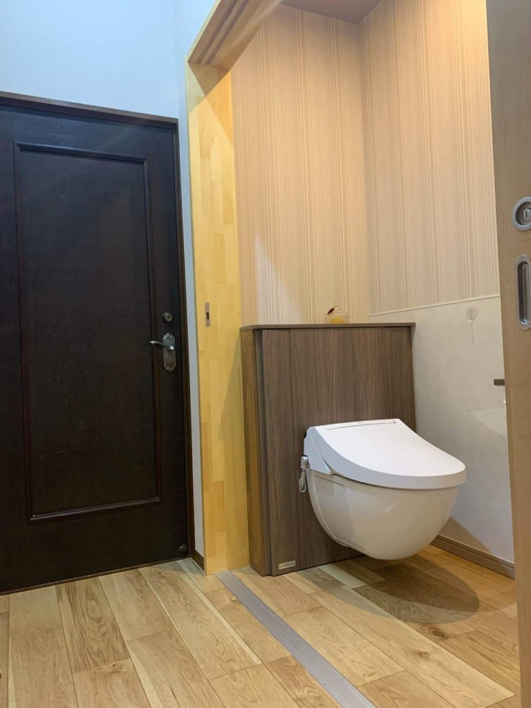 トイレはご家族のみが使用されるとのことから、将来スペースが必要になった際に対応できるよう建具を2枚引きこみ戸に、全てを壁内に引き込める設計にすることで、廊下側のスペースも活用し、約1坪分の広さを確保。車いすでも出入りしやすい空間を実現しました。