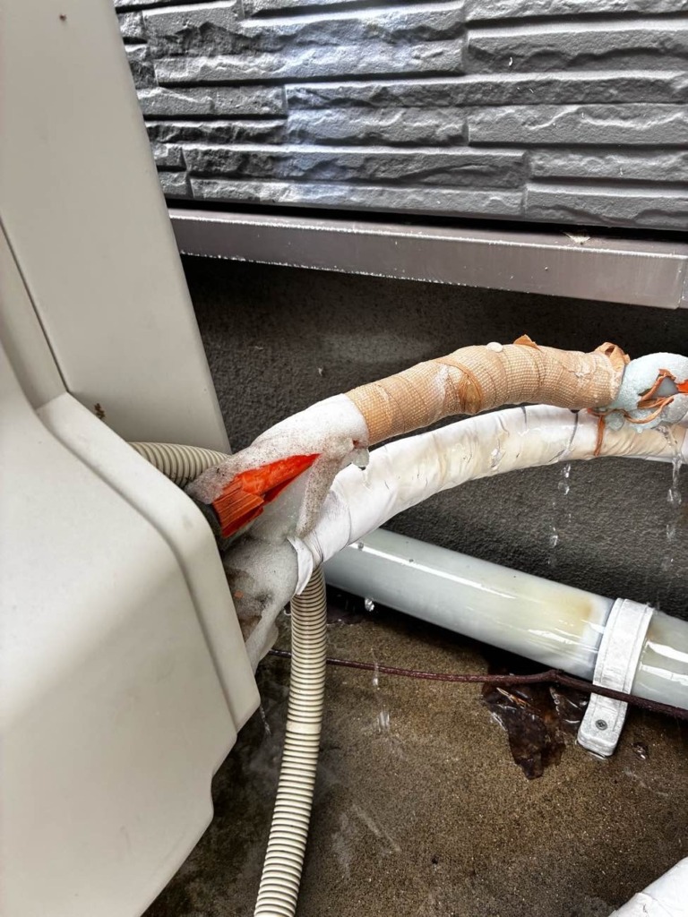 その日に配管の工事をさせて頂き、無事その日のうちにお湯が使えるようになりましたが、大体寿命が10年から15年と言われています。今回はエコキュート本体と隣にあるヒートポンプとの間の連絡管がアルミ三層管という部材が使われいなかったために高温のお湯と凍結により耐えられず破裂していました。しっかり保温材を使っているかどうか、また配管はどんな物を使っているかでも、漏水の原因も変わっていきます。