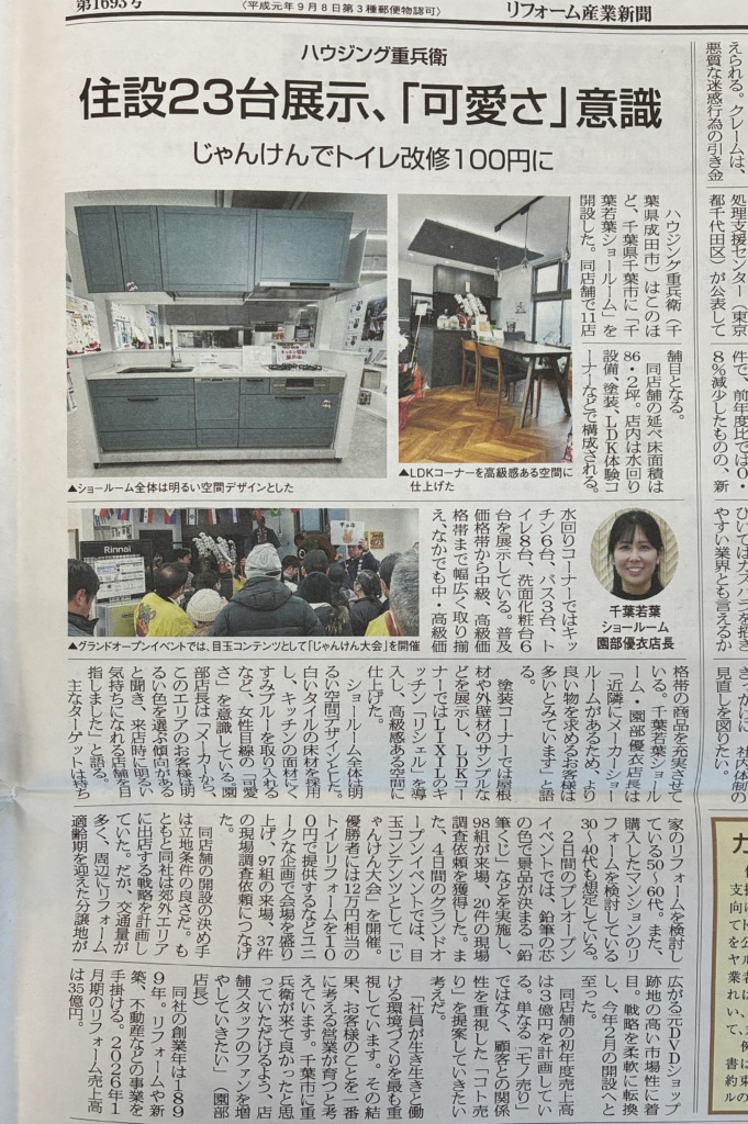 【メディア掲載】リフォーム産業新聞にて千葉若葉ショールーム店が紹介されました! #新聞 2026年4月24日 2026年4月20日発行の「リフォーム産業新聞」にて、ハウジング重兵衛11店舗目の千葉若葉ショールーム店を紹介いただきました! 一覧に戻る 【メディア掲載】東京新聞に多能工職人育成学校JMCAが掲載されました! 【受賞】『HiKOKI BUILDER’S SPIRIT PROJECT』にて、弊社の松井が「スピリット賞」を受賞しました!